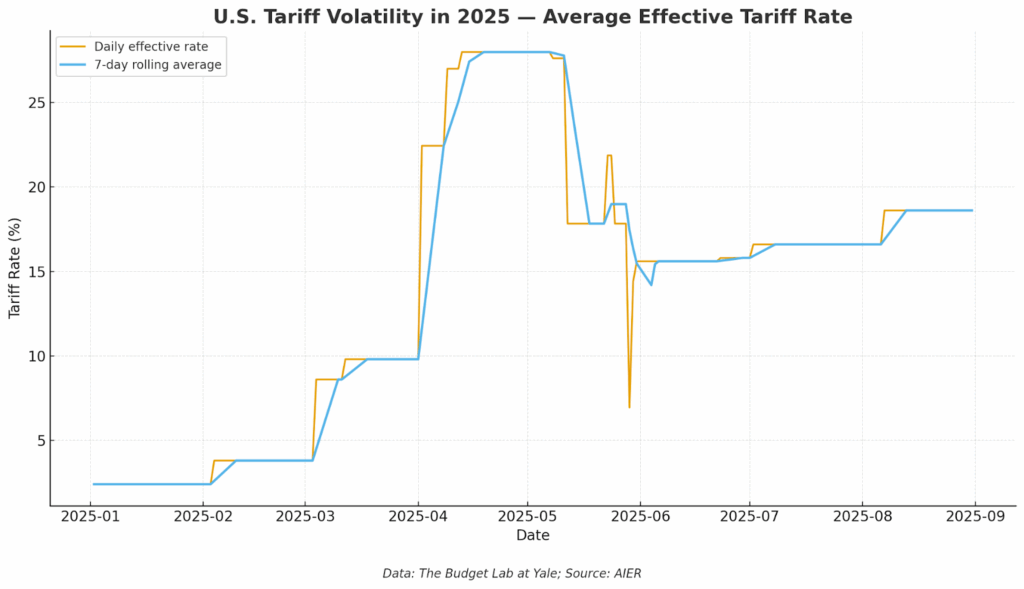 Copper alone is instructive. The administration slapped on a 50 percent tariff, sending shockwaves through markets, then quietly rolled it back —although not without consequences. This is trade policy drafted as if by people who’ve never managed a balance sheet, let alone understand the basics of margins and managerial accounting. For anyone watching, the episode was a case study: threats move markets, tariffs impose costs, and then political calculation intervenes to soften or reverse course. The volatility of the average effective tariff rates since April 2 are erratic enough to attribute to rudderless, arbitrary choices — the mark of policymakers lurching from headline to headline, not executing a coherent economic plan.