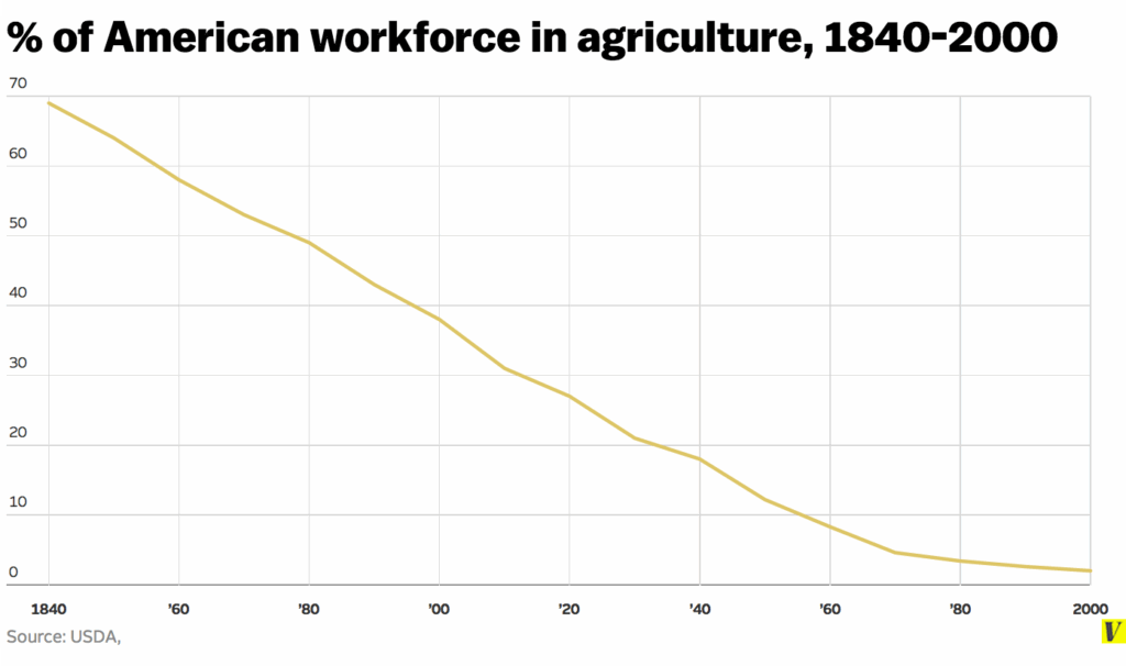 This is crystal clear if you look at the history of labor specialization. Since the mid 19th century, agriculture has gone from employing about 70 percent of US workers to employing only 2 percent. Meanwhile, the productivity of US agriculture has massively increased due to improved farming technology and food has become about 10 times more affordable for blue-collar workers in the last century.