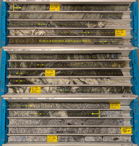 - 3.46 m @ 1.25% WO3, 0.08% Sn, 1.93% Cu and 13.92 g/t Ag from 463.54 m, containing:
