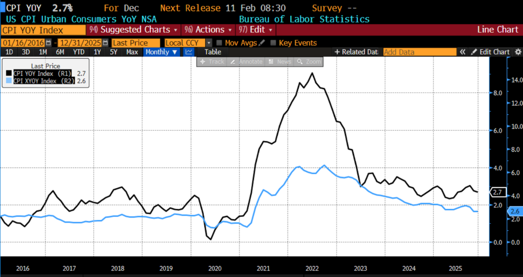 On the year-over-year side, December 2025 headline data rose to 2.7 percent, which matched forecasts. The core index, which excludes food and energy, rose 2.6 percent — slightly less than the expected 2.7 percent.