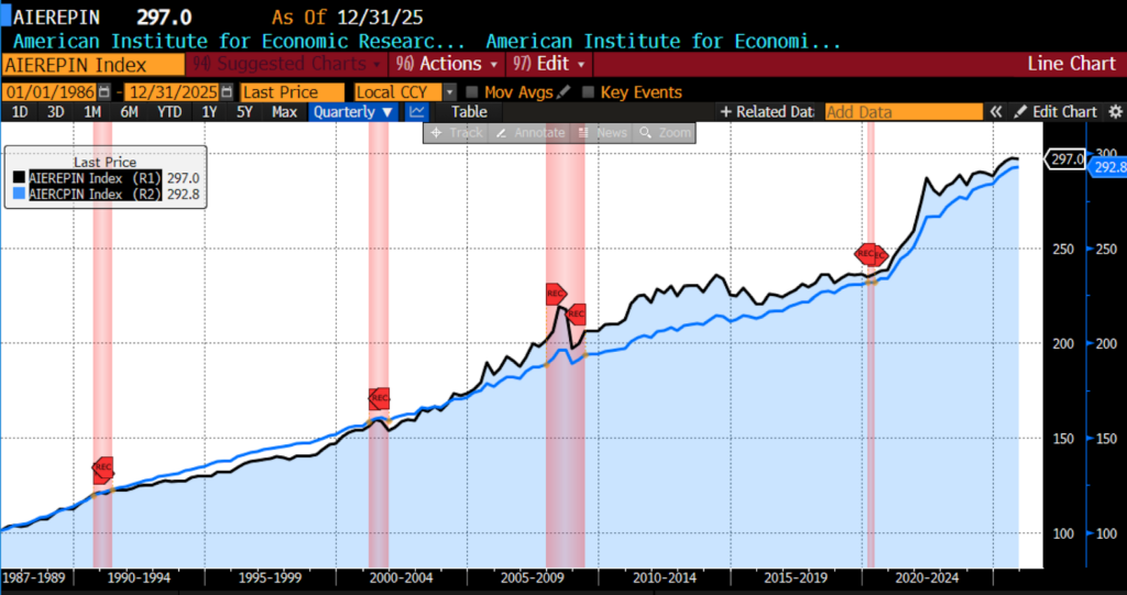 AIER Everyday Price Index vs. US Consumer Price Index (NSA, 1987 = 100)