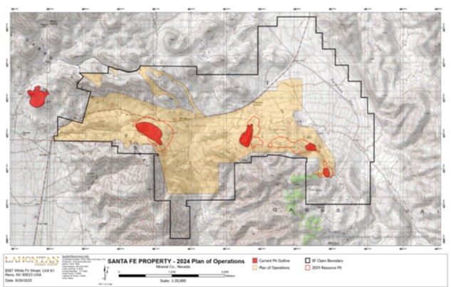 Kimberly Ann, Lahontan Gold Corp. Executive Chair, Founder, CEO, and President commented: ‘Receiving approval of the Santa Fe Mine project EPOO represents a landmark milestone for Lahontan. Until now, the Company’s exploration activities were limited to a five-acre disturbance area, significantly restricting its ability to step out from known resources and fully assess the exploration potential of the Santa Fe Mine Project. With the approval of the EPOO, Lahontan can now explore a 12.2 km² area encompassing multiple well-defined geological and geochemical targets located between and adjacent to existing gold and silver resources. The expanded permit area also allows for drill testing of the historical heap leach pads, which may contain remnant mineralization of potential economic interest. This approval positions the Company to evaluate the broader gold and silver endowment of the Santa Fe Mine project and to unlock the full potential of its strategic land position in Nevada’s Walker Lane. Lahontan would also like to thank the staff of the Carson City office of the BLM for their efficient and timely completion of the EPOO.’