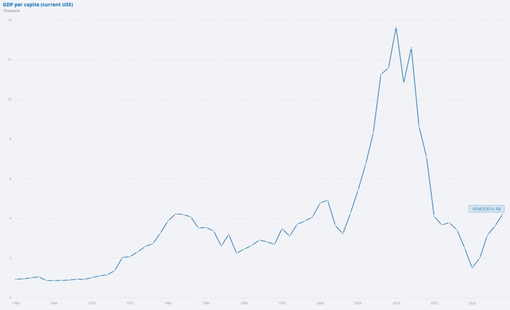 Twenty-five years ago, its GDP was roughly $4,800 per person. In 2014, it was nearly $16,000. But the latest estimates for 2024 and 2025 are about $4,000 per person — roughly 20 percent less than in 2000 and a shocking 75 percent less than in 2014. Poverty rates in Venezuela have skyrocketed from less than a quarter of its population to over half. Yet, Venezuela has the largest known oil reserves of any country in the world – an estimated 300 billion barrels — 10 percent more than Saudi Arabia and seven times more than the United States.