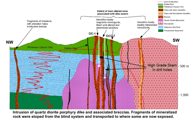 Historical drill holes cut high grade skarn mineralization including 23 meters with 0.54% Cu at 640 meters depth (hole OC-1), 18 m with 1.4% Cu and 4.65% Zn at 830 meters depth (hole OCC-7), and 7.6 m with 1.73% Cu and 0.11% Zn at 703 meters and 4.6 meters with 1.4% Cu and 0.88% Zn at 716 meters (OCC-8). Mineralization occurs within a several hundred-meter-thick altered zone hosted in favorable Paleozoic carbonate rocks that underly a sequence of Cretaceous andesitic volcanic rocks. These carbonates are the same rocks that host the high-grade copper mineralization at Freeport ‘ s nearby Christmas mine. The historic drilling intersected a blind mineralized intrusion associated with the skarn mineralization, providing an immediate drill target that is believed to be the source of the mineralization at Hot Breccia (Figure 2). Several magnetic highs in the region surrounding the proposed intrusion may also indicated buried skarn mineralization and provide additional exploration targets.